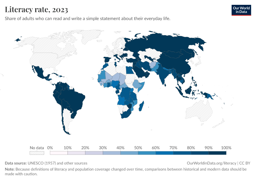 - The literacy rate measures the share of the population older than 14 years who can read and write. It is based on a combination of sources from the World Bank, CIA Factbook, and additional academic sources. You can find more information on literacy here.