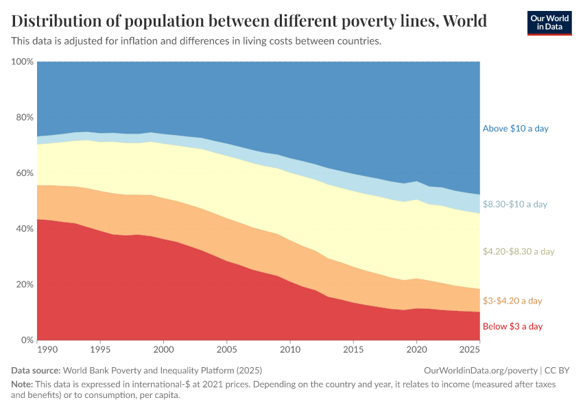 As we emphasize, the international poverty line is very low — well below what would be required to live a healthy and comfortable life. In the following chart, we also show data on the share (or you can switch to absolute numbers in the Settings using the “Display relative values” toggle) of the population living above or below higher poverty lines.