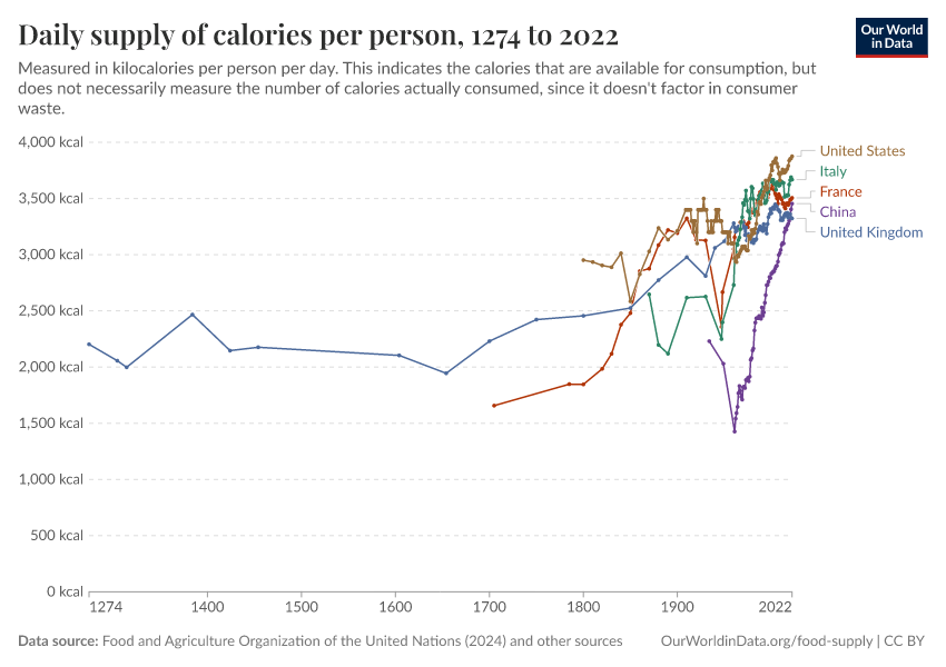 As productivity increased, famines and the exclusion of the poor due to hunger and too little energy became a thing of the past in both France and England. The improving supply of food in both countries is shown in the visualization below. In terms of calories, the average food supply in France more than doubled over the last 300 years.1.