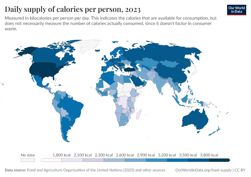 In this interactive map, we see the differences in how many calories each person gets every day in different countries.