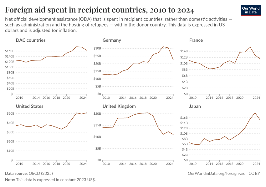 Simon van Teutem, Hannah Ritchie, and Pablo Arriagada (2025) - “How much foreign aid is spent domestically rather than overseas?” Published online at OurWorldinData.org. Retrieved from: 'https://auto-wildfires.owid.pages.dev:8789/20260223-070107/foreign-aid-domestic-overseas.html' [Online Resource] (archived on February 23, 2026).BibTeX citation