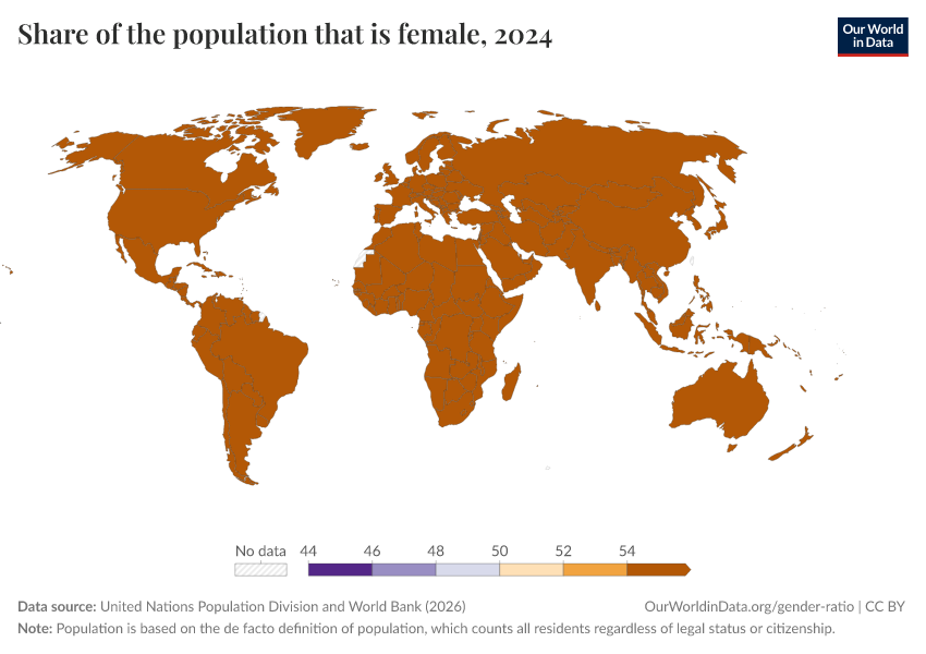 Countries over 50 percent (shown in orange) have a higher female population, while those below 50 percent (shown in purple) have a higher male population.