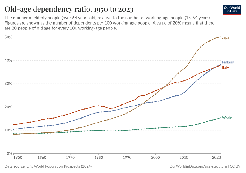 “Data Page: Old-age dependency ratio, age old”. Our World in Data (2026). Data adapted from United Nations. Retrieved from https://auto-wildfires.owid.pages.dev:8789/20260225-004721/grapher/age-dependency-ratio-old.html [online resource] (archived on February 25, 2026).How to cite this data