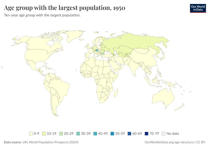 “Data Page: Ten year age-group with the highest population”. Our World in Data (2026). Data adapted from United Nations. Retrieved from https://auto-wildfires.owid.pages.dev:8789/20260225-014904/grapher/age-group-with-the-largest-population.html [online resource] (archived on February 25, 2026).How to cite this data