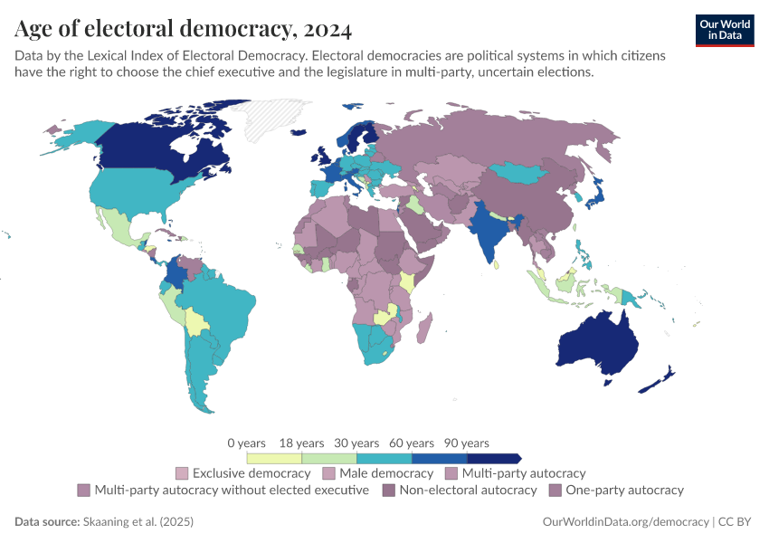 Skaaning et al. (2025) – processed by Our World in Data. “Age of electoral democracy” [dataset]. Skaaning et al., “Lexical Index of Electoral Democracy (LIED) v6.8” [original data]. Retrieved March 2, 2026 from https://auto-wildfires.owid.pages.dev:8789/20260119-065148/grapher/age-of-electoral-democracy-lexical.html (archived on January 19, 2026).