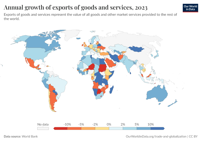 “Data Page: Annual growth of exports of goods and services”. Our World in Data (2026). Data adapted from World Bank. Retrieved from https://auto-wildfires.owid.pages.dev:8789/20260130-180113/grapher/annual-growth-of-exports-of-goods-and-services.html [online resource] (archived on January 30, 2026).How to cite this data