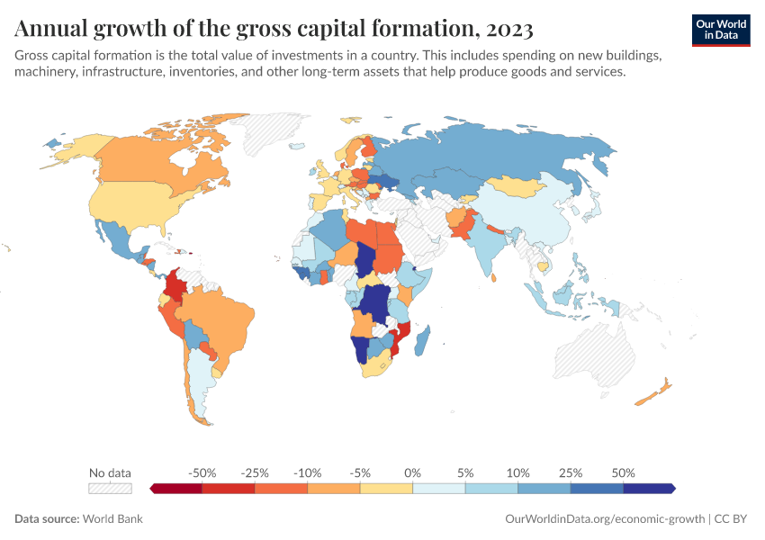World Bank – processed by Our World in Data. “Annual growth of the gross capital formation” [dataset]. World Bank, “World Bank national accounts data, and OECD National Accounts data files.” [original data]. Retrieved March 2, 2026 from https://auto-wildfires.owid.pages.dev:8789/20260130-180113/grapher/annual-growth-of-the-gross-capital-formation.html (archived on January 30, 2026).