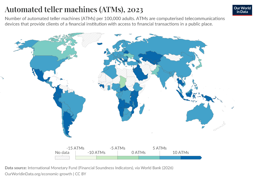 “Data Page: Automated teller machines (ATMs)”. Our World in Data (2026). Data adapted from Financial Access Survey - IMF, via World Bank. Retrieved from https://auto-wildfires.owid.pages.dev:8789/20260202-181317/grapher/automated-teller-machines-atms-per-100000-adults.html [online resource] (archived on February 2, 2026).How to cite this data
