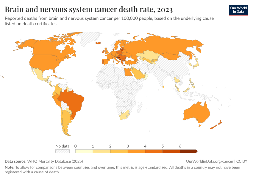 WHO Mortality Database (2025) – with minor processing by Our World in Data. “Brain and nervous system cancer death rate” [dataset]. WHO Mortality Database, “WHO Mortality Database” [original data]. Retrieved March 2, 2026 from https://auto-wildfires.owid.pages.dev:8789/20250909-093708/grapher/brain-and-nervous-system-cancer-death-rate.html (archived on September 9, 2025).