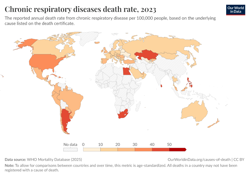 “Data Page: Chronic respiratory diseases death rate”, part of the following publication: Saloni Dattani, Fiona Spooner, Hannah Ritchie, and Max Roser (2023) - “Causes of Death”. Data adapted from WHO Mortality Database. Retrieved from https://auto-wildfires.owid.pages.dev:8789/20250909-093708/grapher/chronic-respiratory-diseases-death-rate-who-mdb.html [online resource] (archived on September 9, 2025).How to cite this data