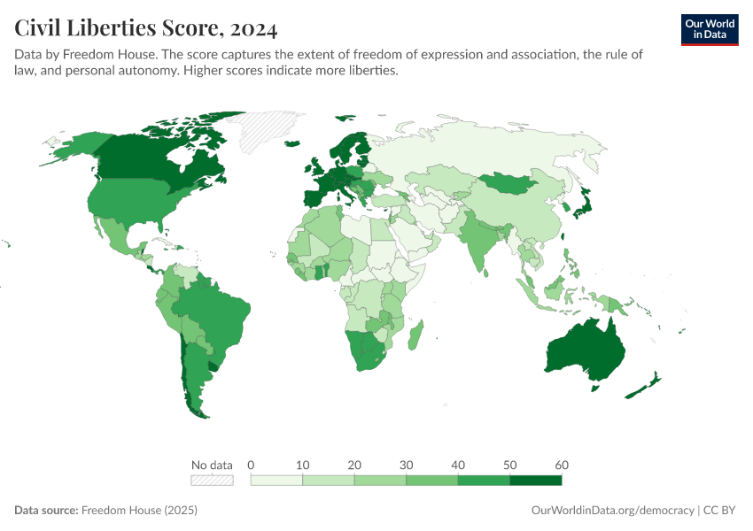 Freedom House (2025) – processed by Our World in Data. “Civil Liberties Score” [dataset]. Freedom House, “Freedom in the World” [original data]. Retrieved March 2, 2026 from https://auto-wildfires.owid.pages.dev:8789/20260204-170225/grapher/civil-liberties-score-fh.html (archived on February 4, 2026).