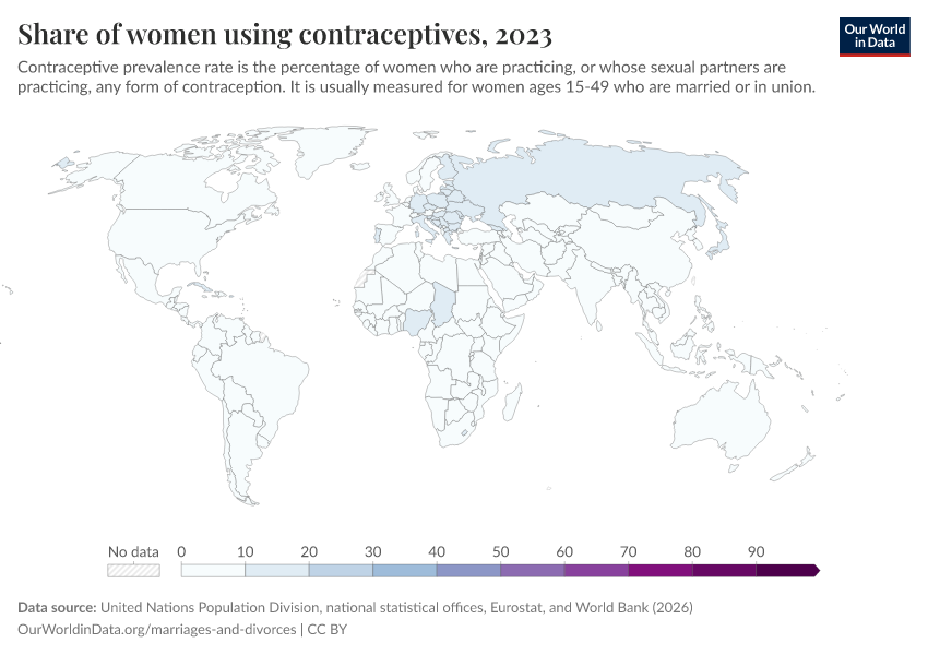 “Data Page: Share of women using contraceptives”. Our World in Data (2026). Data adapted from Demographic and Health Surveys (DHS), Multiple Indicator Cluster Surveys (MICS), and UN Population Division, via World Bank. Retrieved from https://auto-wildfires.owid.pages.dev:8789/20260202-181317/grapher/contraceptive-prevalence-any-methods-of-women-ages-15-49.html [online resource] (archived on February 2, 2026).How to cite this data