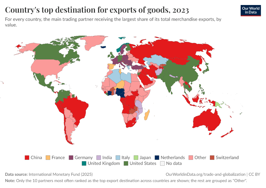 International Monetary Fund (2025) – with major processing by Our World in Data. “Top export partner category” [dataset]. International Monetary Fund, “International Trade in Goods (by partner country) (IMTS)” [original data]. Retrieved March 3, 2026 from https://auto-wildfires.owid.pages.dev:8789/20251114-012441/grapher/countrys-top-destination-for-exports-of-goods.html (archived on November 14, 2025).