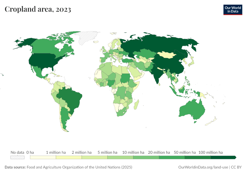 Food and Agriculture Organization of the United Nations (2025) – with major processing by Our World in Data. “Cropland area – UN FAO” [dataset]. Food and Agriculture Organization of the United Nations, “Land, Inputs and Sustainability: Land Use” [original data]. Retrieved March 3, 2026 from https://auto-wildfires.owid.pages.dev:8789/20260226-122020/grapher/cropland-area.html (archived on February 26, 2026).