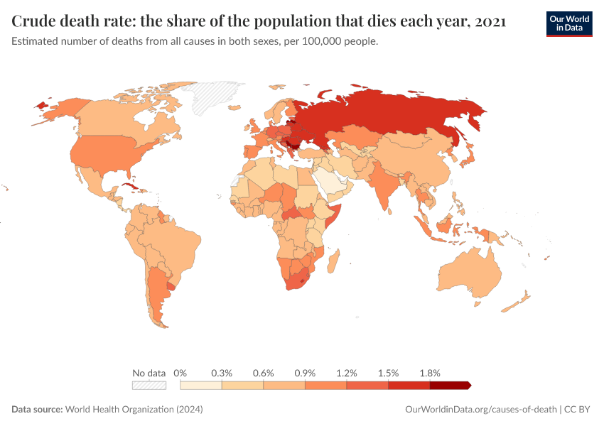 World Health Organization (2024) – with major processing by Our World in Data. “Crude death rate: the share of the population that dies each year” [dataset]. World Health Organization, “Global Health Estimates” [original data]. Retrieved March 3, 2026 from https://auto-wildfires.owid.pages.dev:8789/20250909-093708/grapher/crude-death-rate-the-share-of-the-population-that-dies-each-year-who.html (archived on September 9, 2025).