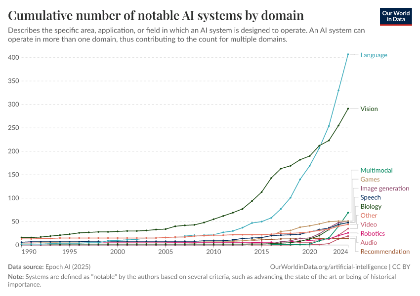 Epoch AI (2025) – with major processing by Our World in Data. “Cumulative number of notable AI systems by domain” [dataset]. Epoch AI, “Parameter, Compute and Data Trends in Machine Learning” [original data]. Retrieved March 3, 2026 from https://auto-wildfires.owid.pages.dev:8789/20260227-144426/grapher/cumulative-number-of-notable-ai-systems-by-domain.html (archived on February 27, 2026).