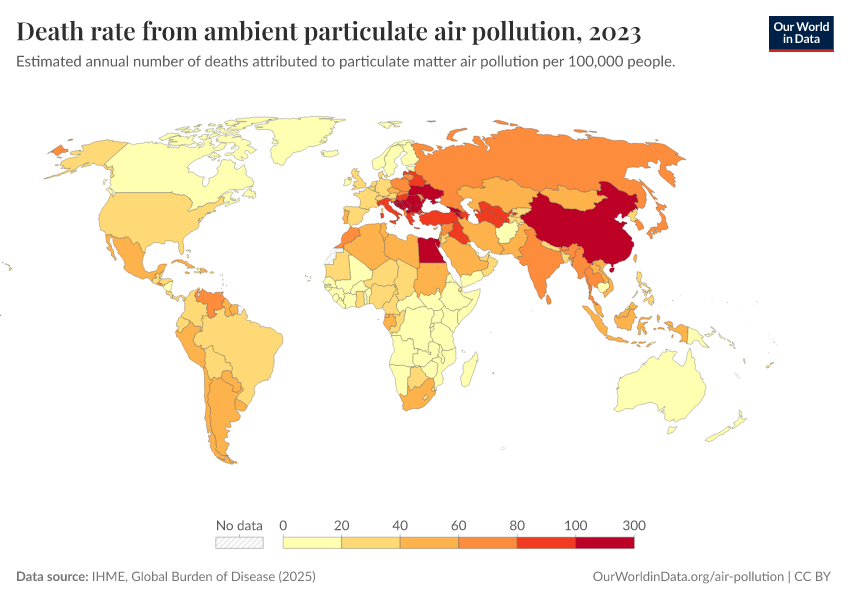 IHME, Global Burden of Disease (2025) – with major processing by Our World in Data. “Death rate from ambient particulate air pollution” [dataset]. IHME, Global Burden of Disease, “Global Burden of Disease - Risk Factors - Deaths” [original data]. Retrieved March 3, 2026 from https://auto-wildfires.owid.pages.dev:8789/20260213-112438/grapher/death-rate-from-ambient-particulate-air-pollution.html (archived on February 13, 2026).