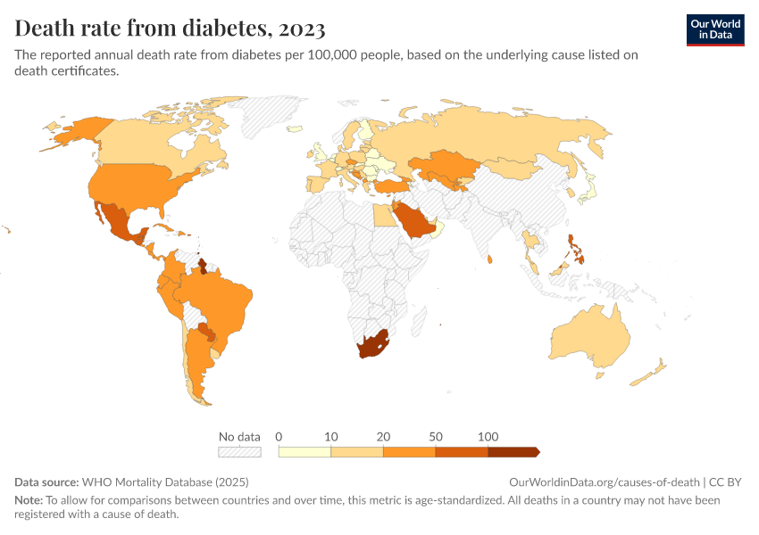 “Data Page: Death rate from diabetes”, part of the following publication: Saloni Dattani, Fiona Spooner, Hannah Ritchie, and Max Roser (2023) - “Causes of Death”. Data adapted from WHO Mortality Database. Retrieved from https://auto-wildfires.owid.pages.dev:8789/20250909-093708/grapher/death-rate-from-diabetes-who-mdb.html [online resource] (archived on September 9, 2025).How to cite this data
