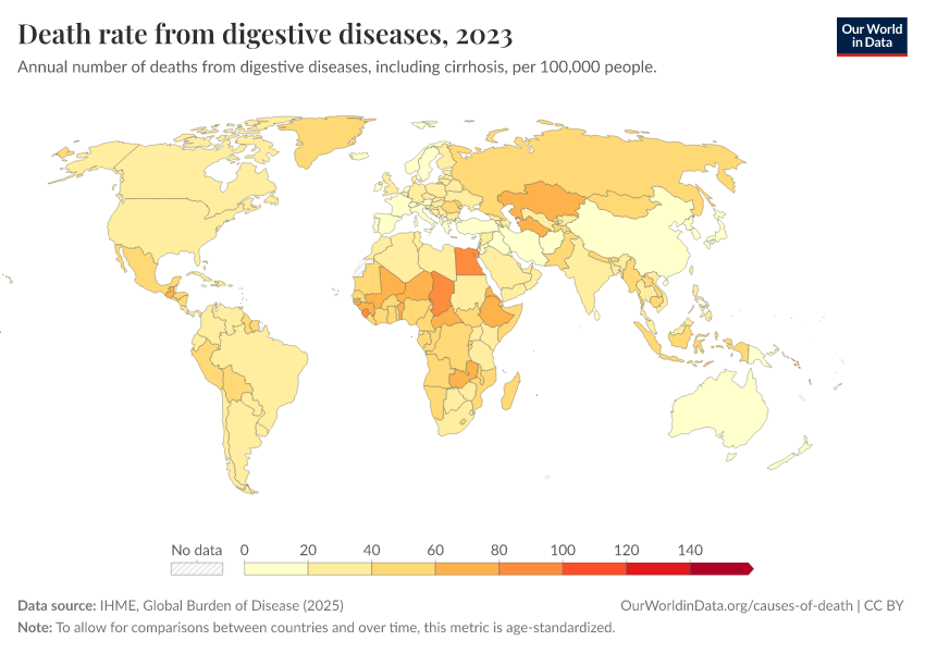 IHME, Global Burden of Disease (2025) – with major processing by Our World in Data. “Death rate from digestive diseases” [dataset]. IHME, Global Burden of Disease, “Global Burden of Disease - Deaths” [original data]. Retrieved March 2, 2026 from https://auto-wildfires.owid.pages.dev:8789/20260211-174736/grapher/death-rate-from-digestive-diseases.html (archived on February 11, 2026).