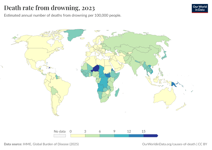 IHME, Global Burden of Disease (2025) – with major processing by Our World in Data. “Death rate from drowning” [dataset]. IHME, Global Burden of Disease, “Global Burden of Disease - Deaths” [original data]. Retrieved March 2, 2026 from https://auto-wildfires.owid.pages.dev:8789/20260211-174736/grapher/death-rate-from-drowning.html (archived on February 11, 2026).