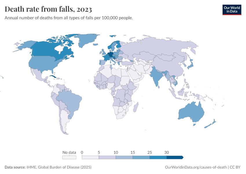 IHME, Global Burden of Disease (2025) – with major processing by Our World in Data. “Death rate from falls” [dataset]. IHME, Global Burden of Disease, “Global Burden of Disease - Deaths” [original data]. Retrieved March 2, 2026 from https://auto-wildfires.owid.pages.dev:8789/20260211-174736/grapher/death-rate-from-falls-gbd-rate.html (archived on February 11, 2026).