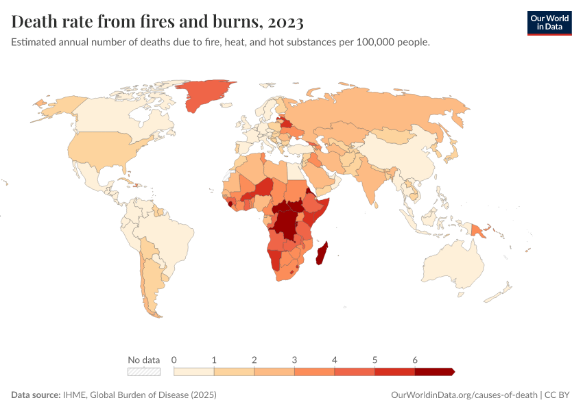 IHME, Global Burden of Disease (2025) – with major processing by Our World in Data. “Death rate from fires and burns” [dataset]. IHME, Global Burden of Disease, “Global Burden of Disease - Deaths” [original data]. Retrieved March 3, 2026 from https://auto-wildfires.owid.pages.dev:8789/20260211-174736/grapher/death-rate-from-fires-and-burns-ihme.html (archived on February 11, 2026).