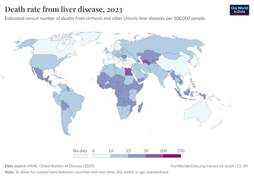 IHME, Global Burden of Disease (2025) – with major processing by Our World in Data. “Death rate from liver disease” [dataset]. IHME, Global Burden of Disease, “Global Burden of Disease - Deaths” [original data]. Retrieved March 3, 2026 from https://auto-wildfires.owid.pages.dev:8789/20260211-174736/grapher/death-rate-from-liver-disease.html (archived on February 11, 2026).