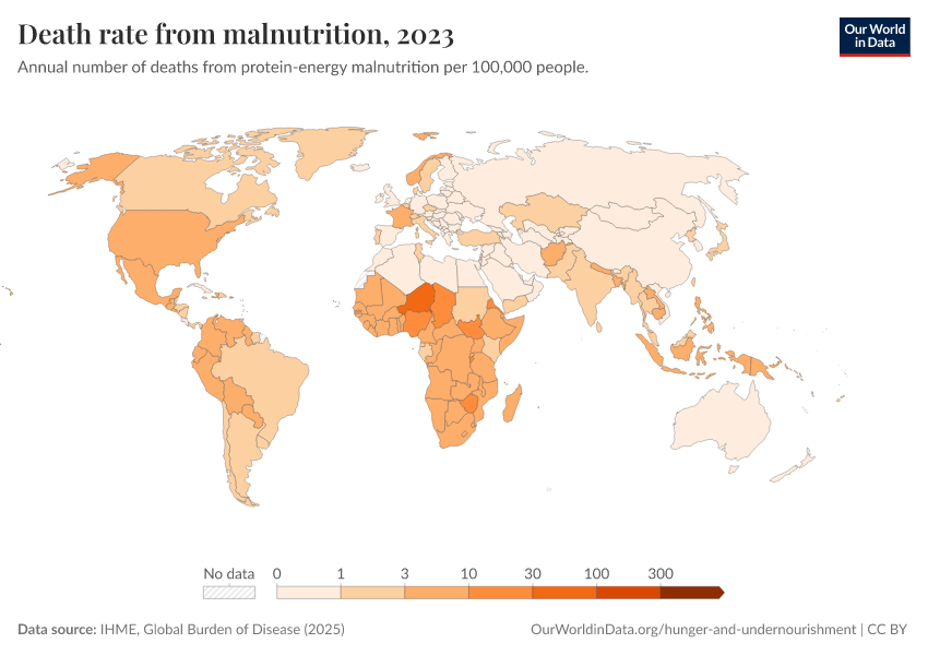 IHME, Global Burden of Disease (2025) – with major processing by Our World in Data. “Death rate from malnutrition” [dataset]. IHME, Global Burden of Disease, “Global Burden of Disease - Deaths” [original data]. Retrieved March 2, 2026 from https://auto-wildfires.owid.pages.dev:8789/20260211-174736/grapher/death-rate-from-malnutrition.html (archived on February 11, 2026).