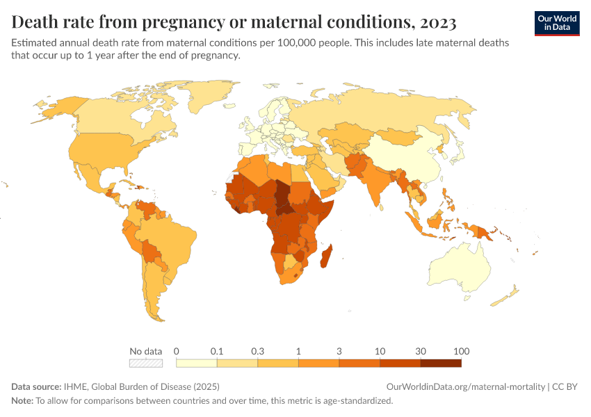IHME, Global Burden of Disease (2025) – with major processing by Our World in Data. “Death rate from pregnancy or maternal conditions” [dataset]. IHME, Global Burden of Disease, “Global Burden of Disease - Deaths” [original data]. Retrieved March 3, 2026 from https://auto-wildfires.owid.pages.dev:8789/20260211-174736/grapher/death-rate-from-maternal-disorders-ihme.html (archived on February 11, 2026).