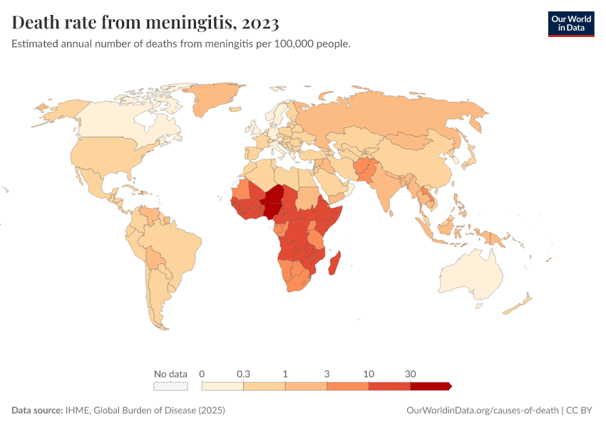 “Data Page: Death rate from meningitis”, part of the following publication: Esteban Ortiz-Ospina and Max Roser (2016) - “Global Health”. Data adapted from IHME, Global Burden of Disease. Retrieved from https://auto-wildfires.owid.pages.dev:8789/20260211-174736/grapher/death-rate-from-meningitis-gbd.html [online resource] (archived on February 11, 2026).How to cite this data