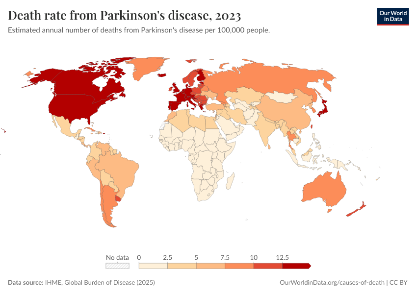 “Data Page: Death rate from Parkinson's disease”, part of the following publication: Esteban Ortiz-Ospina and Max Roser (2016) - “Global Health”. Data adapted from IHME, Global Burden of Disease. Retrieved from https://auto-wildfires.owid.pages.dev:8789/20260211-174736/grapher/death-rate-from-parkinsons-disease-gbd.html [online resource] (archived on February 11, 2026).How to cite this data