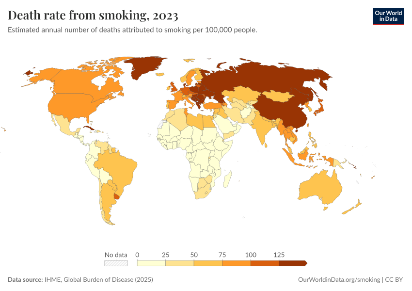 IHME, Global Burden of Disease (2025) – with major processing by Our World in Data. “Death rate from smoking” [dataset]. IHME, Global Burden of Disease, “Global Burden of Disease - Risk Factors - Deaths” [original data]. Retrieved March 2, 2026 from https://auto-wildfires.owid.pages.dev:8789/20260213-113303/grapher/death-rate-from-smoking.html (archived on February 13, 2026).