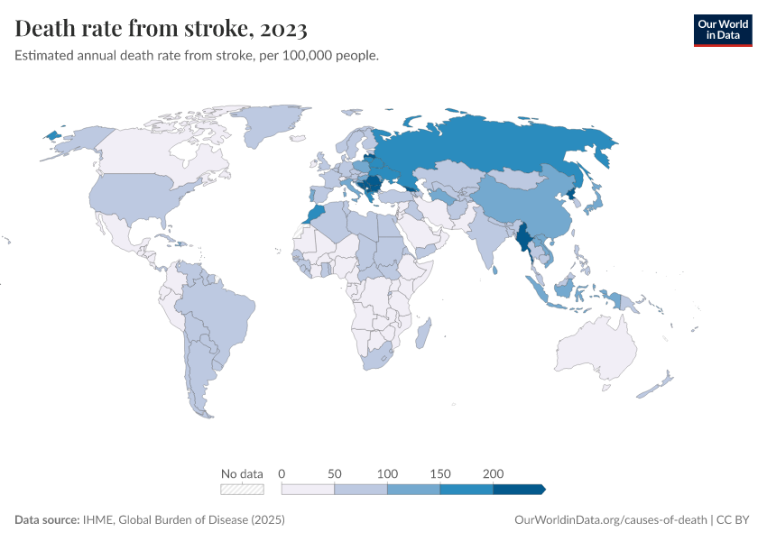 IHME, Global Burden of Disease (2025) – with major processing by Our World in Data. “Death rate from stroke” [dataset]. IHME, Global Burden of Disease, “Global Burden of Disease - Deaths” [original data]. Retrieved March 2, 2026 from https://auto-wildfires.owid.pages.dev:8789/20260211-174736/grapher/death-rate-from-strokes.html (archived on February 11, 2026).
