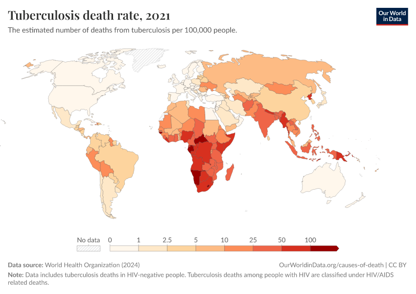 World Health Organization (2024) – with major processing by Our World in Data. “Tuberculosis death rate” [dataset]. World Health Organization, “Global Health Estimates” [original data]. Retrieved March 2, 2026 from https://auto-wildfires.owid.pages.dev:8789/20250909-093708/grapher/death-rate-from-tuberculosis-ghe.html (archived on September 9, 2025).