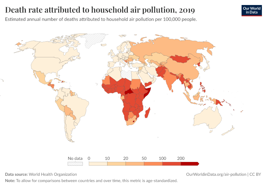 World Health Organization – processed by Our World in Data. “Death rate attributed to household air pollution” [dataset]. World Health Organization, “Global Health Observatory (GHO), World Health Organisation (WHO)” [original data]. Retrieved March 2, 2026 from https://auto-wildfires.owid.pages.dev:8789/20260130-180113/grapher/death-rate-household-air-pollution.html (archived on January 30, 2026).