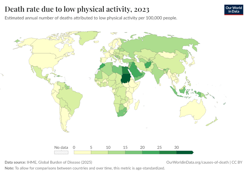 “Data Page: Death rate due to low physical activity”, part of the following publication: Esteban Ortiz-Ospina and Max Roser (2016) - “Global Health”. Data adapted from IHME, Global Burden of Disease. Retrieved from https://auto-wildfires.owid.pages.dev:8789/20260213-112438/grapher/death-rates-due-to-low-physical-activity.html [online resource] (archived on February 13, 2026).How to cite this data
