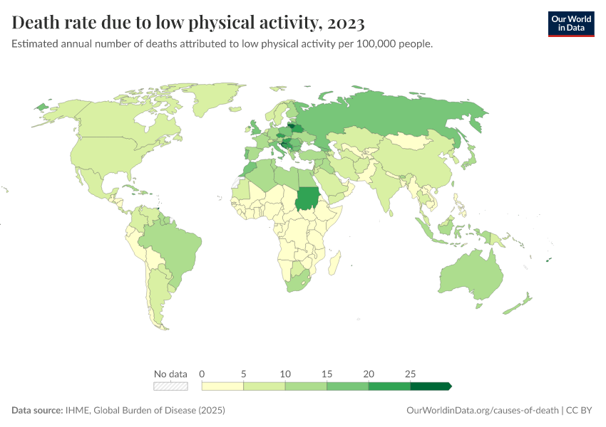 “Data Page: Death rate due to low physical activity”, part of the following publication: Esteban Ortiz-Ospina and Max Roser (2016) - “Global Health”. Data adapted from IHME, Global Burden of Disease. Retrieved from https://auto-wildfires.owid.pages.dev:8789/20260213-112438/grapher/death-rates-due-to-low-physical-activity-gbd.html [online resource] (archived on February 13, 2026).How to cite this data