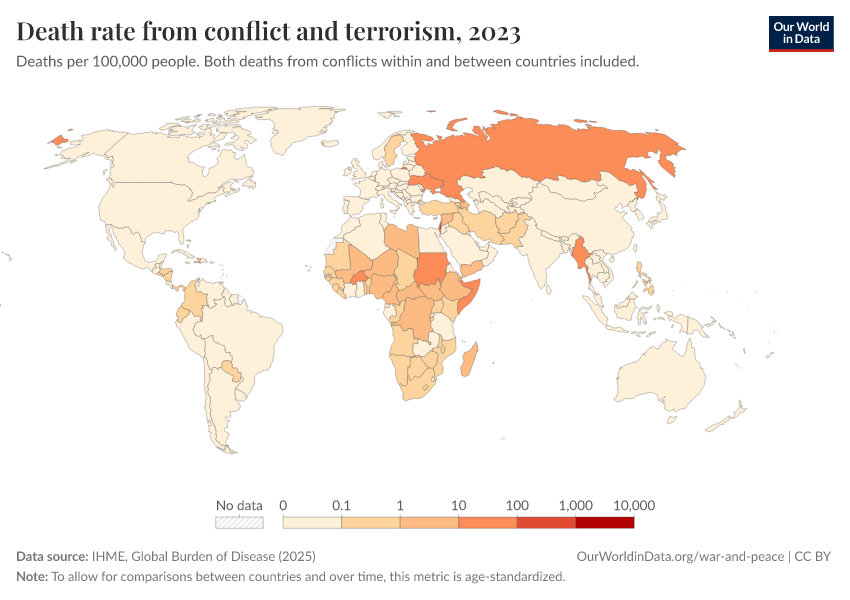 “Data Page: Death rate from conflict and terrorism”, part of the following publication: Esteban Ortiz-Ospina and Max Roser (2016) - “Global Health”. Data adapted from IHME, Global Burden of Disease. Retrieved from https://auto-wildfires.owid.pages.dev:8789/20260211-174736/grapher/death-rates-from-conflict-and-terrorism-gbd.html [online resource] (archived on February 11, 2026).How to cite this data