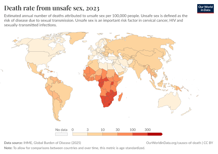 IHME, Global Burden of Disease (2025) – with major processing by Our World in Data. “Death rate from unsafe sex” [dataset]. IHME, Global Burden of Disease, “Global Burden of Disease - Risk Factors - Deaths” [original data]. Retrieved March 3, 2026 from https://auto-wildfires.owid.pages.dev:8789/20260213-113303/grapher/death-rates-from-unsafe-sex.html (archived on February 13, 2026).
