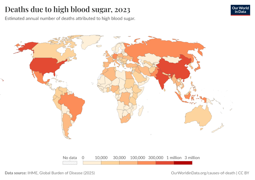 IHME, Global Burden of Disease (2025) – with major processing by Our World in Data. “Deaths due to high blood sugar” [dataset]. IHME, Global Burden of Disease, “Global Burden of Disease - Risk Factors - Deaths” [original data]. Retrieved March 2, 2026 from https://auto-wildfires.owid.pages.dev:8789/20260213-112438/grapher/deaths-due-to-high-blood-sugar.html (archived on February 13, 2026).