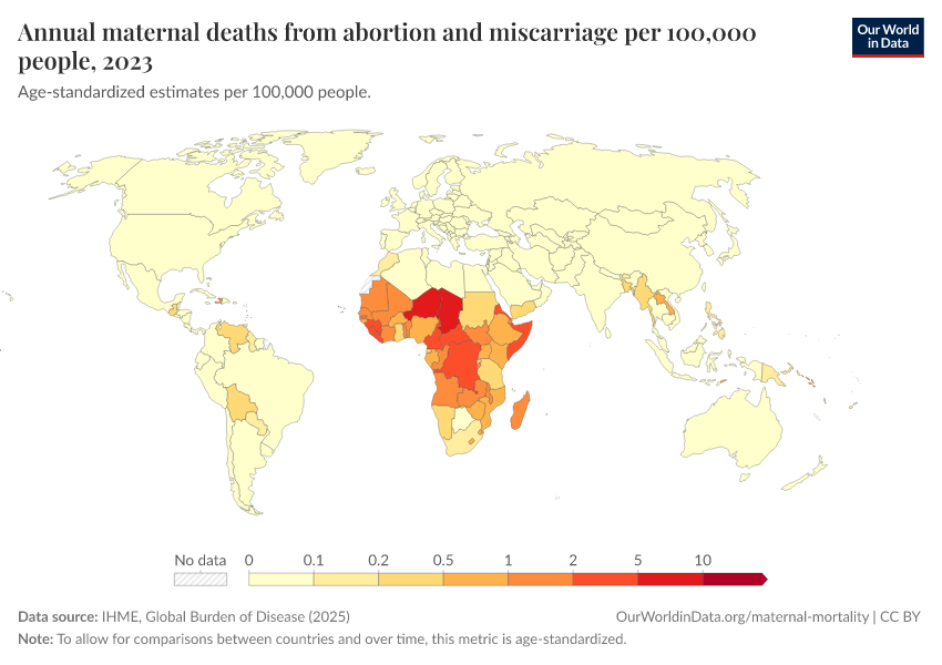 IHME, Global Burden of Disease (2025) – with major processing by Our World in Data. “Annual maternal deaths from abortion and miscarriage per 100,000 people” [dataset]. IHME, Global Burden of Disease, “Global Burden of Disease - Deaths” [original data]. Retrieved March 3, 2026 from https://auto-wildfires.owid.pages.dev:8789/20260211-174736/grapher/deaths-from-abortion-and-miscarriage-per-100000-people.html (archived on February 11, 2026).