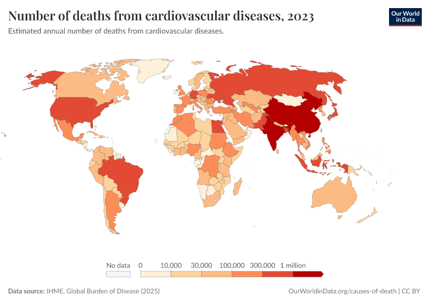 “Data Page: Number of deaths from cardiovascular diseases”, part of the following publication: Esteban Ortiz-Ospina and Max Roser (2016) - “Global Health”. Data adapted from IHME, Global Burden of Disease. Retrieved from https://auto-wildfires.owid.pages.dev:8789/20260211-174736/grapher/deaths-from-cardiovascular-disease.html [online resource] (archived on February 11, 2026).How to cite this data