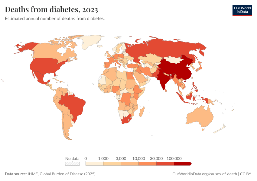 “Data Page: Deaths from diabetes”, part of the following publication: Esteban Ortiz-Ospina and Max Roser (2016) - “Global Health”. Data adapted from IHME, Global Burden of Disease. Retrieved from https://auto-wildfires.owid.pages.dev:8789/20260211-174736/grapher/deaths-from-diabetes.html [online resource] (archived on February 11, 2026).How to cite this data