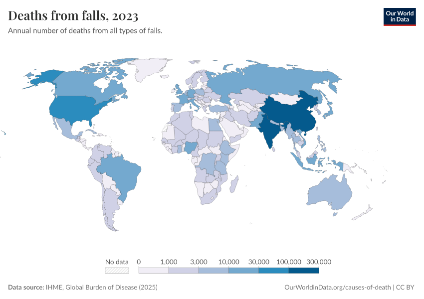 IHME, Global Burden of Disease (2025) – with major processing by Our World in Data. “Deaths from falls” [dataset]. IHME, Global Burden of Disease, “Global Burden of Disease - Deaths” [original data]. Retrieved March 2, 2026 from https://auto-wildfires.owid.pages.dev:8789/20260211-174736/grapher/deaths-from-falls-gbd.html (archived on February 11, 2026).