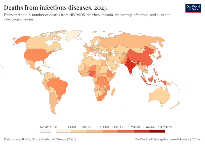 IHME, Global Burden of Disease (2025) – with major processing by Our World in Data. “Deaths from infectious diseases” [dataset]. IHME, Global Burden of Disease, “Global Burden of Disease - Deaths” [original data]. Retrieved March 2, 2026 from https://auto-wildfires.owid.pages.dev:8789/20260211-174736/grapher/deaths-from-infectious-diseases.html (archived on February 11, 2026).