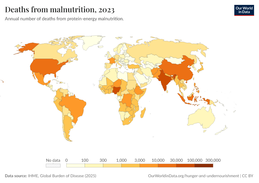IHME, Global Burden of Disease (2025) – with major processing by Our World in Data. “Deaths from malnutrition” [dataset]. IHME, Global Burden of Disease, “Global Burden of Disease - Deaths” [original data]. Retrieved March 2, 2026 from https://auto-wildfires.owid.pages.dev:8789/20260211-174736/grapher/deaths-from-malnutrition.html (archived on February 11, 2026).