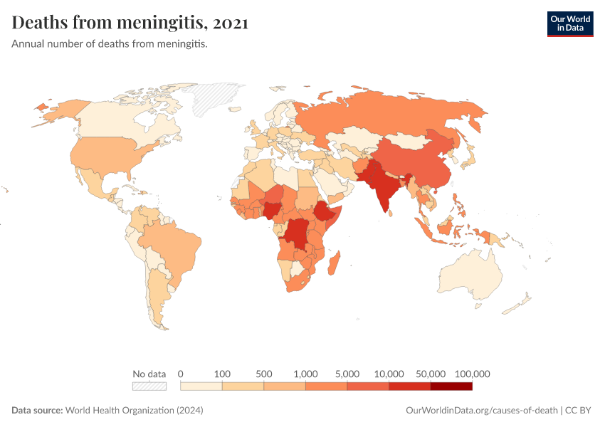 “Data Page: Deaths from meningitis”, part of the following publication: Esteban Ortiz-Ospina and Max Roser (2016) - “Global Health”. Data adapted from World Health Organization. Retrieved from https://auto-wildfires.owid.pages.dev:8789/20250909-093708/grapher/deaths-from-meningitis-ghe.html [online resource] (archived on September 9, 2025).How to cite this data