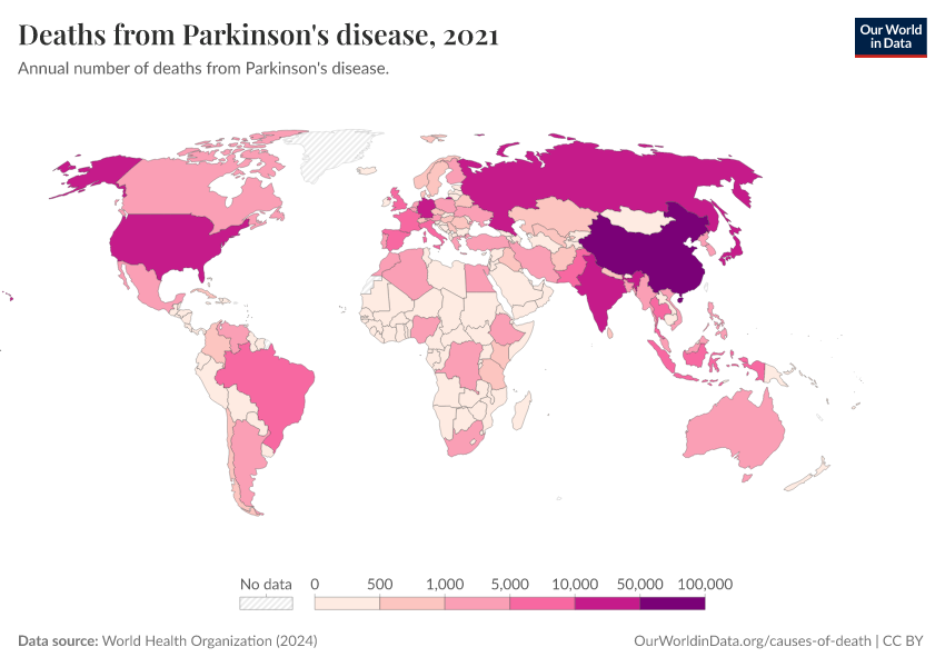 World Health Organization (2024) – with major processing by Our World in Data. “Deaths from Parkinson's disease” [dataset]. World Health Organization, “Global Health Estimates” [original data]. Retrieved March 2, 2026 from https://auto-wildfires.owid.pages.dev:8789/20250909-093708/grapher/deaths-from-parkinsons-disease-ghe.html (archived on September 9, 2025).