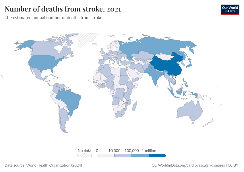 World Health Organization (2024) – with major processing by Our World in Data. “Number of deaths from stroke” [dataset]. World Health Organization, “Global Health Estimates” [original data]. Retrieved March 2, 2026 from https://auto-wildfires.owid.pages.dev:8789/20250909-093708/grapher/deaths-from-strokes-ghe.html (archived on September 9, 2025).