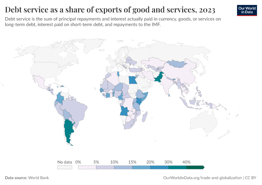 “Data Page: Debt service as a share of exports of good and services”. Our World in Data (2026). Data adapted from World Bank. Retrieved from https://auto-wildfires.owid.pages.dev:8789/20260130-180113/grapher/debt-service-of-exports-of-goods-services.html [online resource] (archived on January 30, 2026).How to cite this data